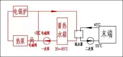 在晚間谷電價(jià)的時(shí)間段中,空氣源熱泵機(jī)組把蓄熱水箱的水溫從35℃提升到50℃,電鍋爐再把水溫提升到95℃。