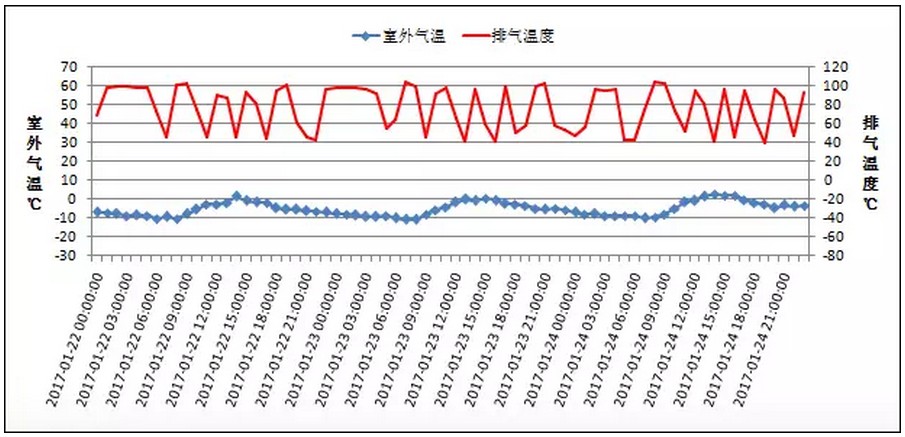 數據顯示這三天時間日平均氣溫-5℃~-6.3℃,最低氣溫-12.2℃,最高氣溫2.9℃,室內溫度始終維持在18.5~21.2℃,機組出水溫度43~48℃,機組回水溫度41~45℃,出回水溫差基本穩定在3℃,壓縮機運行排氣溫度最高103.6℃。