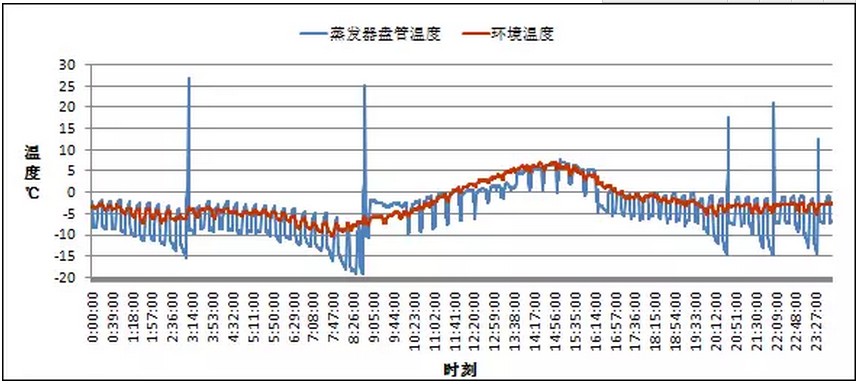 本文選取了2016年12月19日這一天重霧霾天氣,北京市發布了霧霾橙色預警并進行了交通限行。由于北方冬季氣溫低,霧霾、下雪天氣多,極容易造成空氣源熱泵蒸發器大面積結霜,影響制熱效果。從本次監測中選取重霧霾天氣,濕度高,同時氣溫-4℃~8℃也是機組容易結霜的階段。