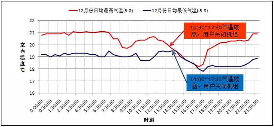 由于本次采集完全是用戶的真實使用情況,根據用戶自己的生活作息及使用習慣調節,在一天中的11:00~17:30,用戶可能外出或者因室外氣溫較高,用戶選擇關閉機組,所以這段時間機組是停機的,室內溫度出現一段下降。即便用戶已經停機,室內溫度還是維持在17.5℃以上,可見用戶房屋保暖效果非常良好。