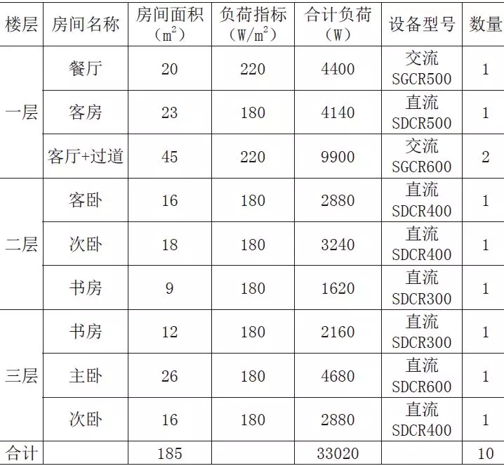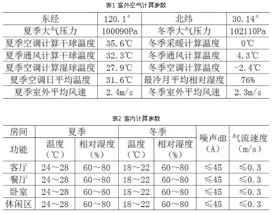 冷負(fù)荷由人體、燈光、設(shè)備、食物等冷負(fù)荷和外圍護(hù)結(jié)構(gòu)(外墻、外窗和外門)及內(nèi)圍護(hù)結(jié)構(gòu)(內(nèi)墻、內(nèi)窗、內(nèi)門和樓板等)的得熱組成;經(jīng)負(fù)荷計(jì)算及規(guī)范,參照本地的設(shè)計(jì)經(jīng)驗(yàn),別墅建筑的空調(diào)冷負(fù)荷設(shè)計(jì)指標(biāo)為180W/m2~220W/m2。