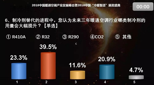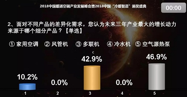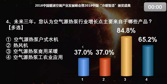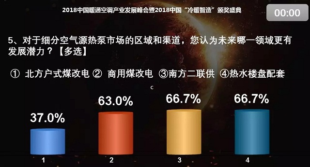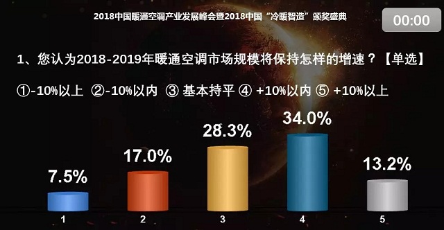 張樹前:我也選了10%以內(nèi)。我非常看好空氣源熱泵這個(gè)行業(yè)。公司今年1-8月份的整體銷售情況很好,大概有二十幾個(gè)區(qū)的項(xiàng)目都中標(biāo)了。今年北京的需求量與去年相比少了很多,北京之外的地方政府財(cái)力是影響戶式水機(jī)進(jìn)行大面積推廣的較大障礙。在采暖這塊,我們?cè)趦?nèi)蒙古、山西、河北也都有很大的項(xiàng)目。此外,除了煤改電,我們還積極布局北方的零售渠道和南方的采暖市場(chǎng),雖然整個(gè)量不是很大,但是增長(zhǎng)非常快,這也是我們未來(lái)后煤改時(shí)代著重打造的市場(chǎng)增長(zhǎng)點(diǎn)。我個(gè)人對(duì)2019年起碼在空氣源熱泵這一塊有堅(jiān)定的信心。考慮到大的背景,我選的是10%以內(nèi)。