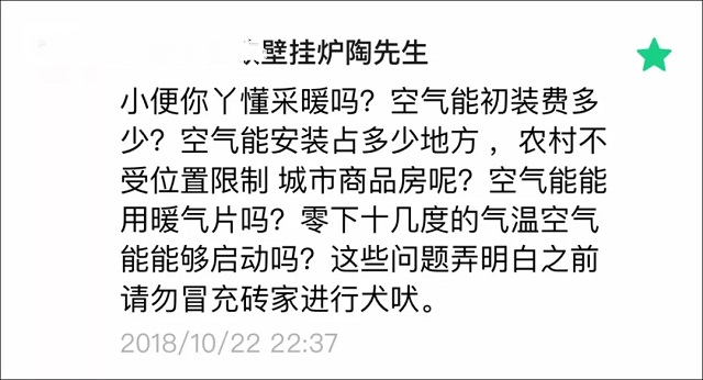 昨天發了一篇計算熱泵采暖費用的文章,一個做壁掛爐的大哥不高興了,出口成臟:“小便你丫懂采暖嗎?空氣能初裝費多少?空氣能安裝占多少地方?農村不受位置限制城市商品房昵?空氣能能用暖氣片嗎?零下十幾度的氣溫空氣能能夠啟動嗎?這些問題弄明白之前請勿冒充磚家進行犬吠。”雖然說,競品之間攻擊很正常,但是他問的問題挺有意思的,想必大家在銷售中也經常遇到,所以我們索性公開解答一下,以正視聽。