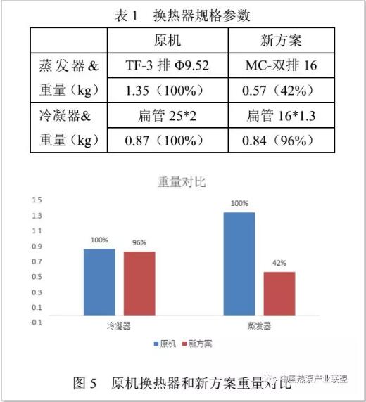 本文蒸發(fā)器如圖3所示,采用微通道換熱器替代原機(jī)銅管翅片換熱器,可以有效降低重量和成本;冷凝器如圖4所示采用新型微通道扁管,并優(yōu)化了與內(nèi)膽外壁面的接觸面積,成本持平的情況下增加了約30%的換熱面積。表1及圖5表示了蒸發(fā)器和冷凝器的規(guī)格及重量對比。