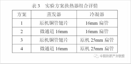 本文為了更好的評價替代方案的蒸發(fā)器和冷凝器的性能,進(jìn)行了四組不同換熱器組合的實(shí)驗(yàn),詳細(xì)的實(shí)驗(yàn)方案如表3所示。