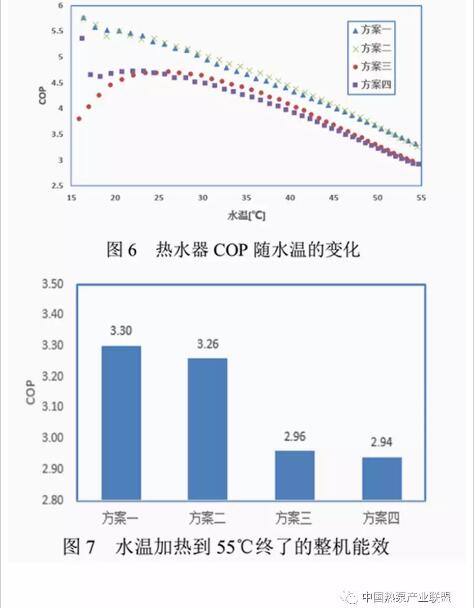 四種方案均是在環(huán)境溫度20/15的標(biāo)況下,將水從15℃加熱到55℃時停止測試。