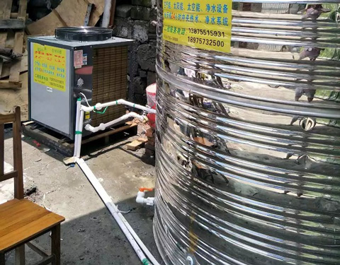 劉總到磚廠進行現場考察后,根據客戶的需求提供了設計方案,在原來的燃煤鍋爐的系統上進行改造,配置一臺5P商用空氣源熱泵熱水器,外加一個4噸的水箱。項目安裝結束后,正式進入運行階段,效果良好,很好地滿足了磚廠的熱水需求。
