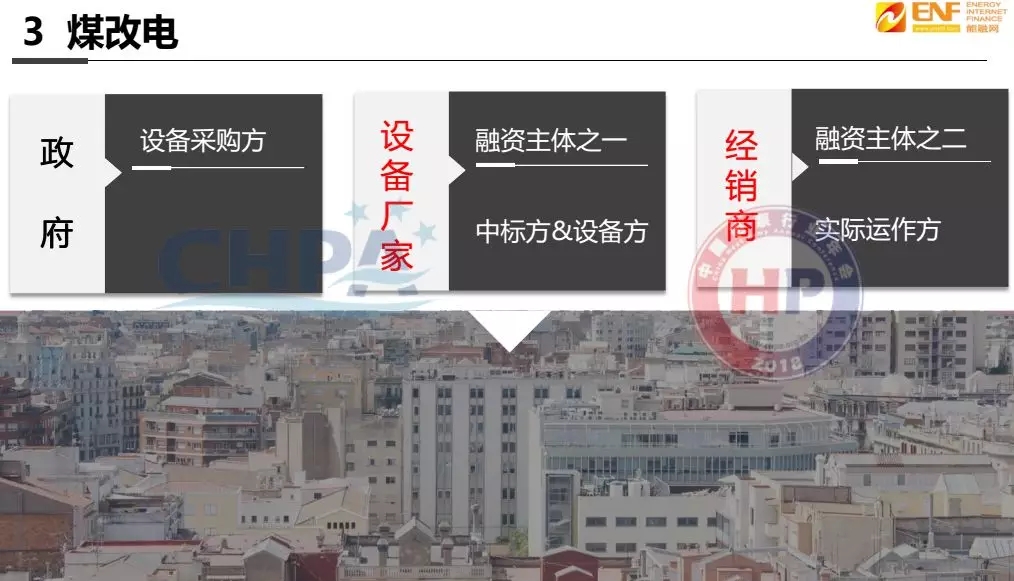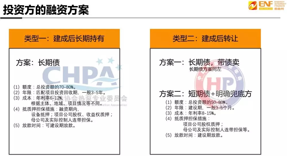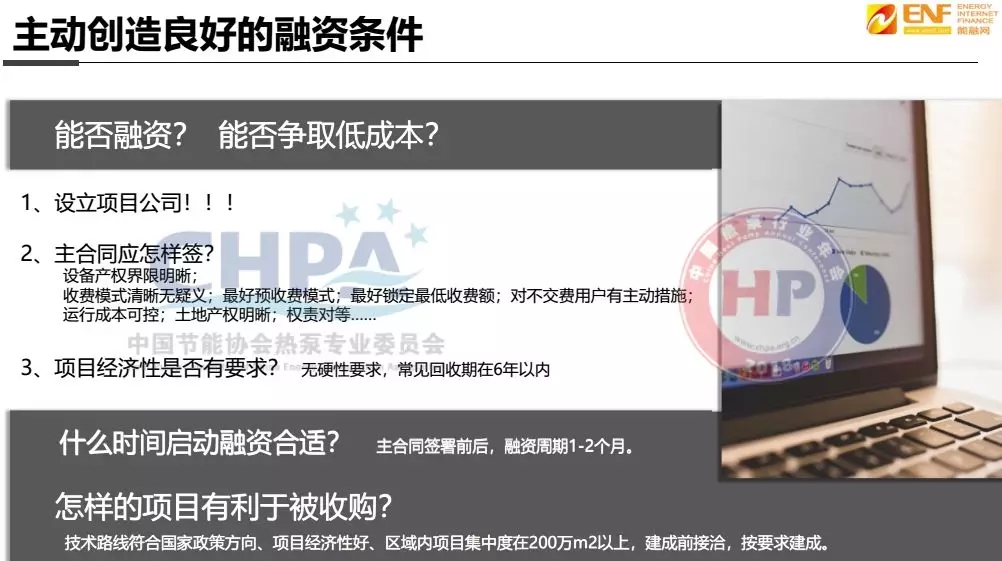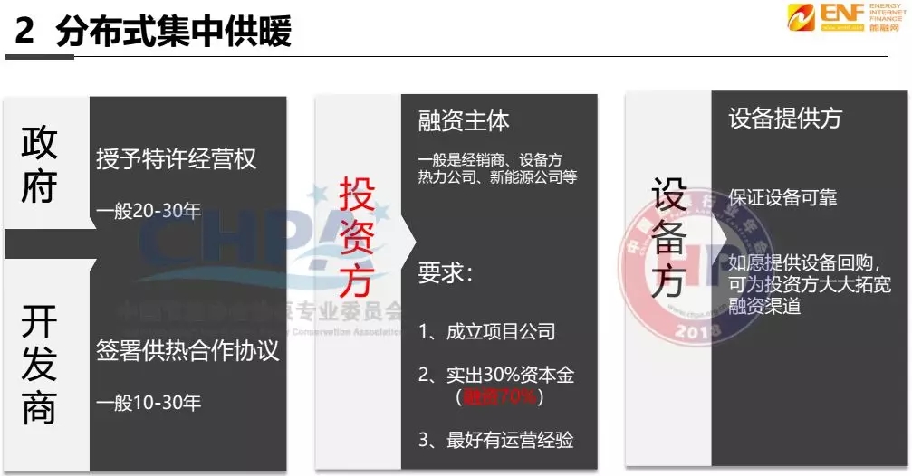 其次,我們還要看投資方,投資方到目前為止五花八門,一般有設(shè)備方、經(jīng)銷商、傳統(tǒng)的熱力公司、新能源公司等,主要對投資方的要求是要有項(xiàng)目公司,要具備運(yùn)營經(jīng)驗(yàn),并且要出30%的保證金。