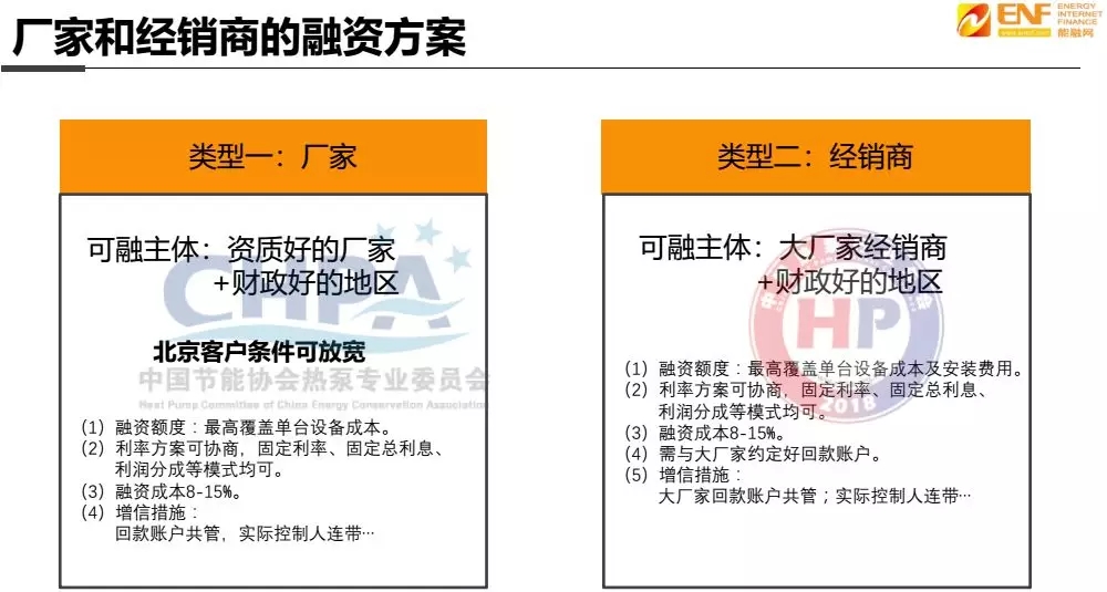 農(nóng)村“煤改電”除北京以外,對其他地方的政策看的不是很明白,簡單來說就跟其他BOT項(xiàng)目一樣,項(xiàng)目建成后,廠家沒有產(chǎn)權(quán)和收益權(quán),所以這一塊我們在做,但是做的并不多。可融主體可以分為資質(zhì)好的廠家和大廠家的經(jīng)銷商兩類(財(cái)政好的地區(qū)),北京客戶條件可以放寬。
