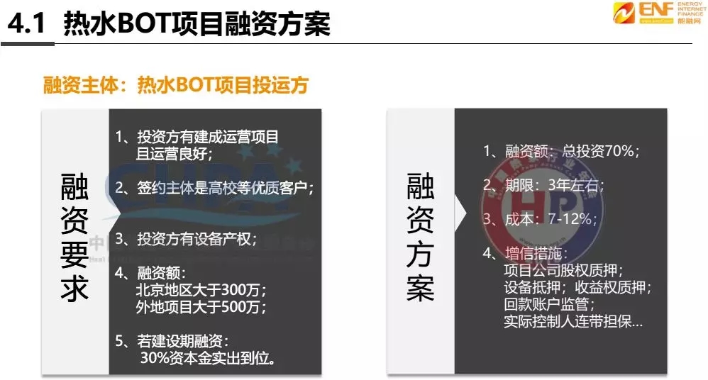 在熱水BOT方面,今年年初我們陸續(xù)接觸這樣的項(xiàng)目,只不過到目前為止沒有規(guī)模化的項(xiàng)目包。具體融資要求是: