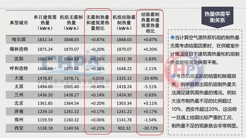 但是實際上,不是這樣一個物理現象,結果是什么?考慮機組實際的結霜和除霜損失,則很容易出現機組制熱量無法滿足建筑需熱量的情況。例如大連市制熱量不足的比例超過10%,西安市超過20%,這說明一旦遇上結霜比較嚴重的工況,制熱量不足的現象就會非常明顯。