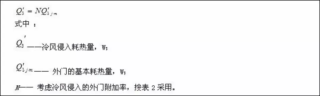 在冬季受風壓和熱壓的作用下,冷空氣由開啟的外門侵入室內。把這部分空氣加熱到室內空氣的溫度所消耗的熱量稱為冷風侵入耗熱量?砂聪率接嬎悖