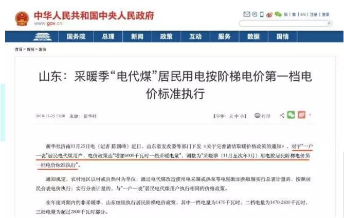 山東發改委發布了《關于完善清潔取暖價格政策的通知》,明確“一戶一表”居民電代煤用戶,采暖季(11月至次年3月)用電按居民階梯電價第一檔電價標準執行。工商業的電代煤項目、居民住宅小區內采用空氣源熱泵電鍋爐等電采暖電輔助加熱取暖項目,按照“清潔取暖用電市場化競價采購”政策執行。