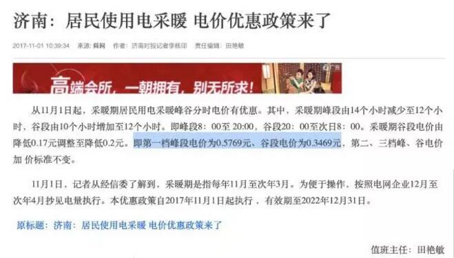 按照山東省政府文件,濟南“一戶一表居民電代煤用戶,采暖季(11月至次年3月)用電按居民階梯電價第一檔電價標準執行”。再疊加“采暖期峰段12個小時,谷段12個小時。即峰段8:00至20:00,谷段20:00至次日8:00。采暖期第一檔峰段電價為0.5769元、谷段電價為0.3469元”。