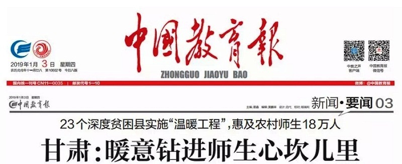 2018年初,根據2018年甘肅省委、省政府為民辦實事項目,甘肅省教育廳研究制定了“農村邊遠地區中小學溫暖工程”實施方案。計劃在23個深度貧困縣(區)實施溫暖工程,解決貧困地區農村中小學校舍采暖問題,實現安全、清潔供暖。